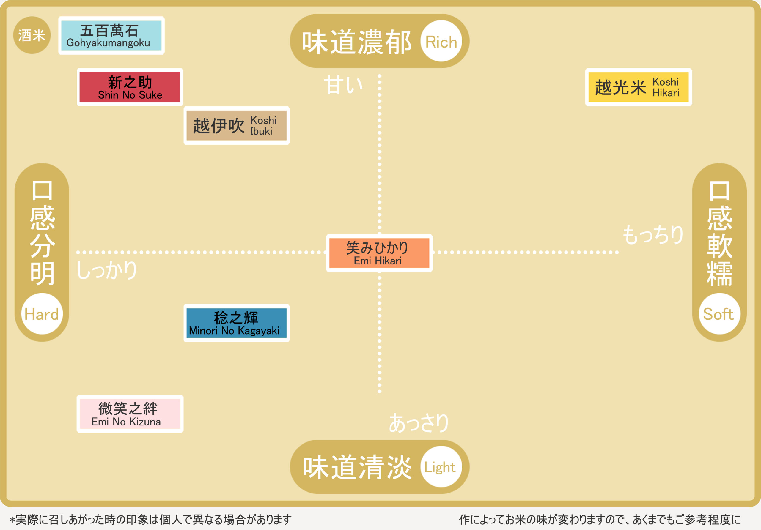 日本で作られているジャポニカ種は種類が豊富で、品種によって特徴が違います。一杯のご飯を最高に美味しく食べるには自分にピッタリのお米を選ぶことがかなり重要です。当店では、料理との相性を考えて開発されたお米を厳選しており、お客様の好みとニーズに合わせて最適なお米をご提案させていただきます。